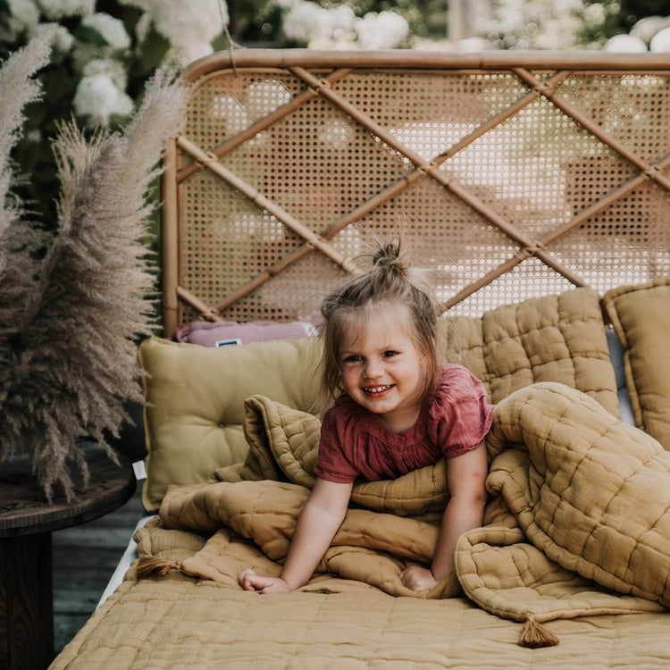 An extremely lightweight coverlet, a large and comfortable pillow with amazing pompons – to make your sleep even more comfortable. The set is made of high quality cotton on both sides. The lightweight, anti-allergic polyester filling has great thermal qualities, is breathable and doesn't retain humidity - all of those characteristic are translated into better sleep for the child and you. Made of the highest quality, attested cotton. The products comprising the set can be mixed and matched to your liking from an array of patterns and designs. Such colourful bedding will lighten up any room! The delicate structure of the muslin is covered with fluffy fibers giving the effect of exceptional softness. Keeping it as long as possible is possible thanks to proper care (details in the "HOW TO WASH"). During use, the fibers can undergo natural peeling, which can be easily leveled with a clothes shaver.